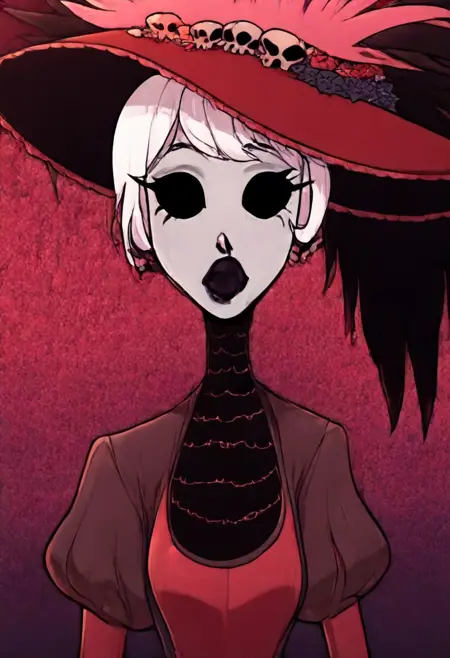 로지: HHOVP-ROS-V1.0, 모자, 흰 머리카락, 빨간 드레스, 검은 입술, 검은 눈, 색상이 있는 피부, 하얀 피부, 주름진 모자, 주름진 소매, 주름 장식, 모자 깃털, 모자 장식, 볼륨 있는 소매, 빈 눈, 모자 꽃, 빨간 머리 장식, 두개골