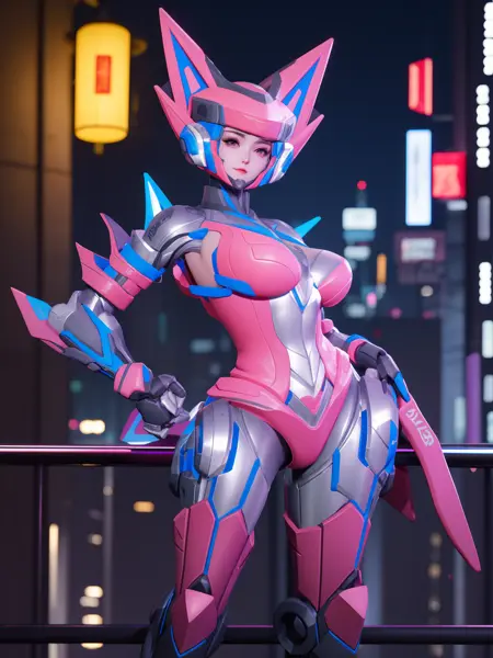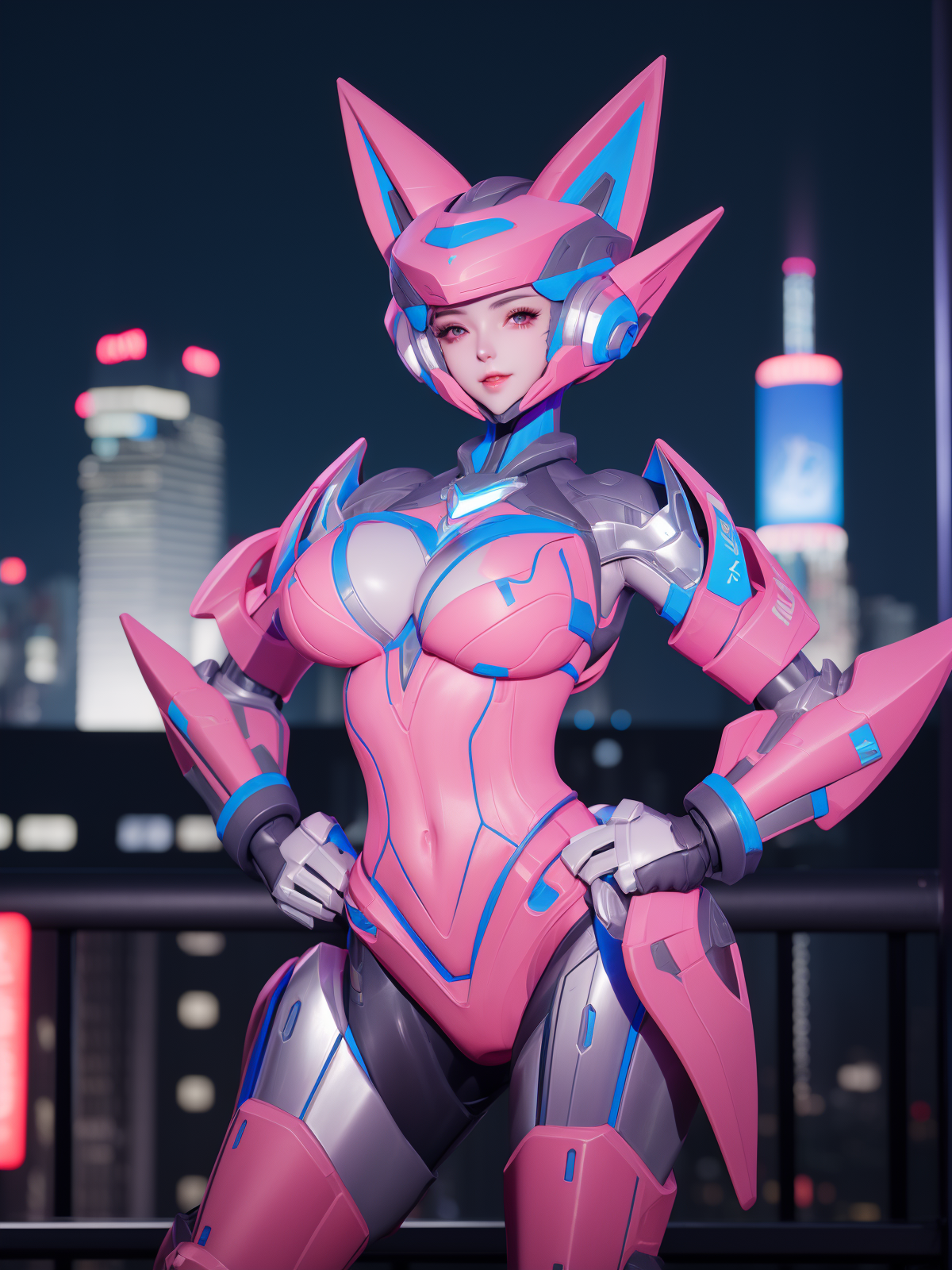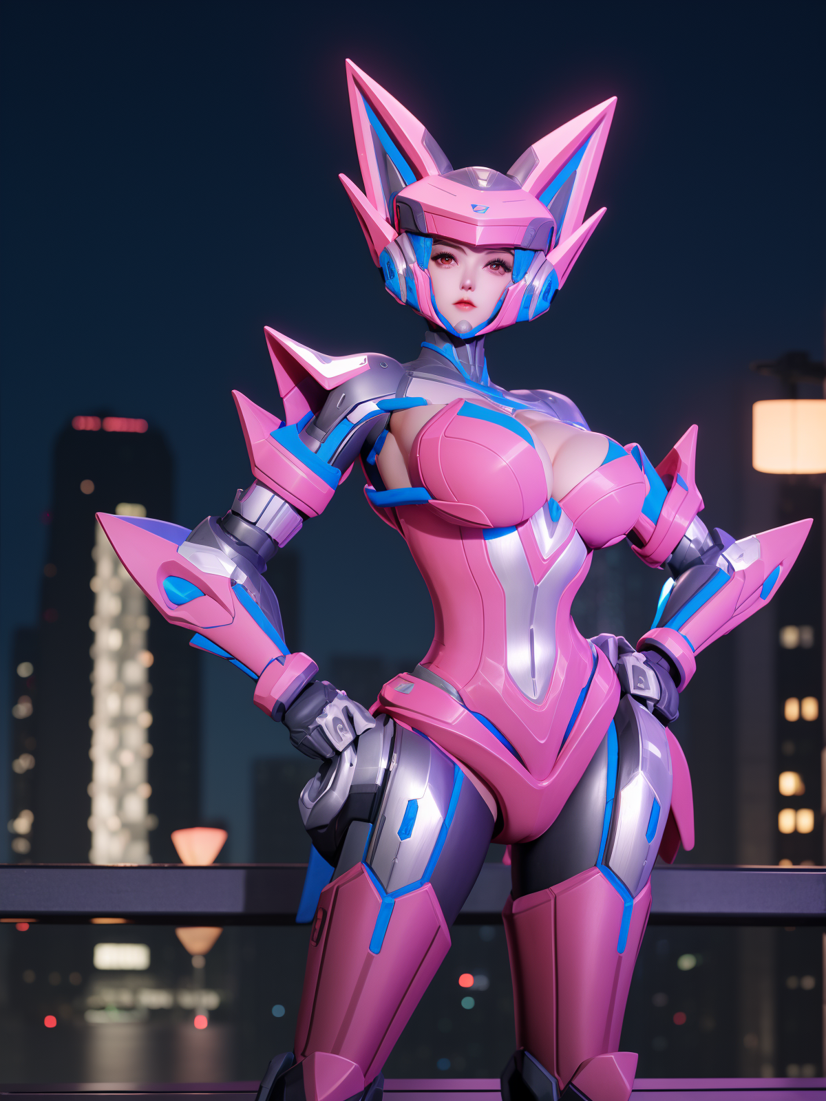 - WZRYsunshangxiangWLJJ, 1girl, solo, mecha, breasts, science fiction, helmet, bodysuit, cityscape, night, looking at viewer, mature female, hand on hip,