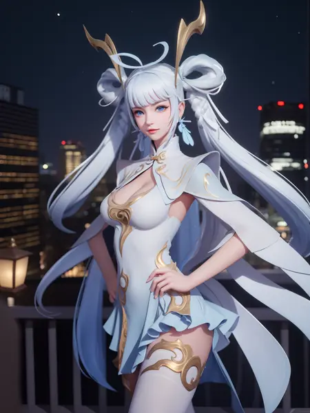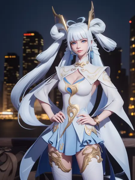 - WZRYsunshangxiangYJLQ, 1girl, solo, long hair, blue eyes, white thighhighs, dress, bangs, breasts, jewelry, twintails, bracelet, headgear, cap, mature female, cityscape, night, looking at viewer, standing, cowboy shot, hand on hip, light smile,