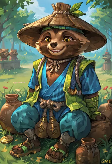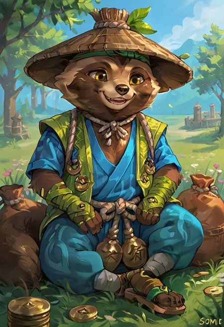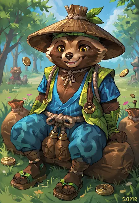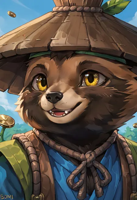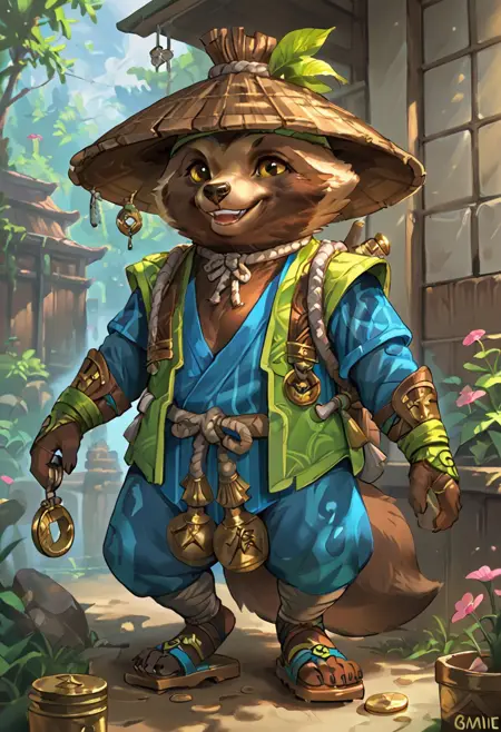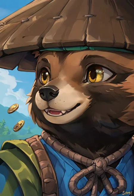 1boy, male, animal, furry, anthro, tanuki, brown fur, yellow eyes, tail, kasa hat, blue kimono, green haori jacket, grey pants, rope belt, sandals, coin ornamets, pot ornamets