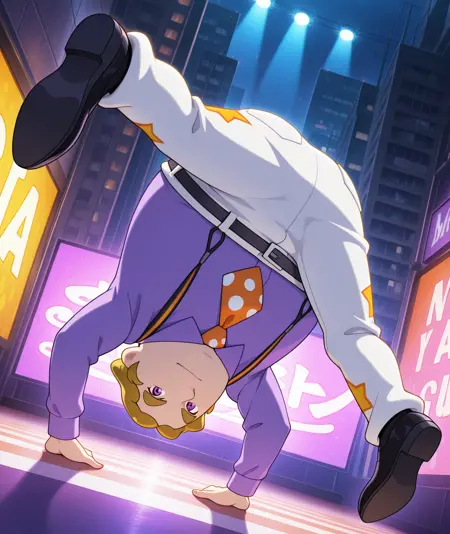 • masterpiece, amazing quality, colorful, urban_background,lora:yuzuru-v1-09:1 BREAK tcc-yuzuru, young, (chubby:0.5), purple shirt, print necktie, suspender pants, breakdance,