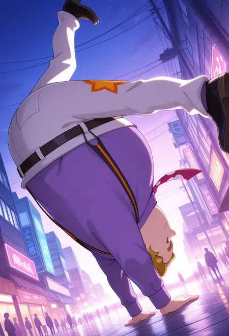 - masterpiece, amazing quality, colorful, urban_background,lora:yuzuru-v1-09:1 BREAK tcc-yuzuru, young, (chubby:0.5), purple shirt, print necktie, suspender pants, breakdance,