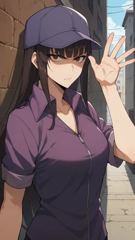 kanae_tawata_sl, long hair, brown hair, sidelocks, bangs, red eyes, purple cap, baseball cap, violet shirt, purple zipper, high collar, rolled-up sleeves, untucked,