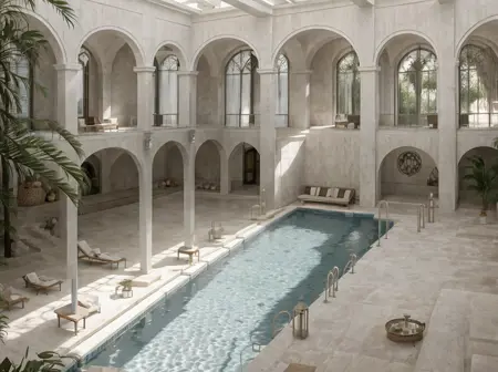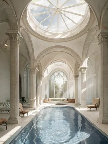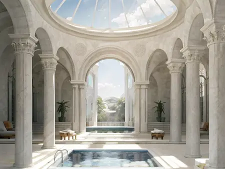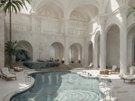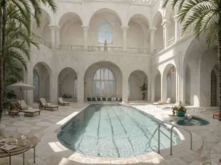 Hotel-y European environments with nice vistas, plants and a surreal feel to it all.