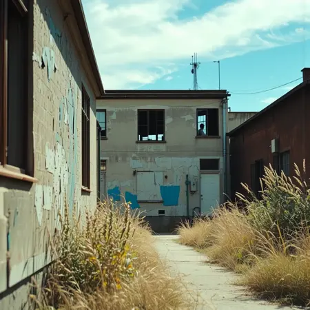 「この画像は、塗装が剥がれ、窓が割れた廃墟となった建物を描写している。シーンは、高い乾いた草や雑草が二つの古い建物の間へと侵入する、人里離れた場所に設定されている。」