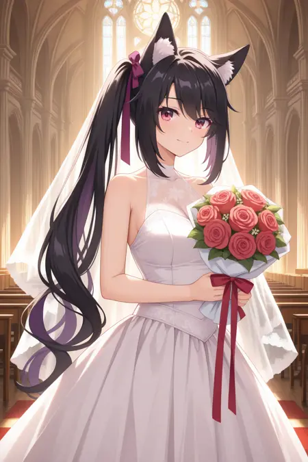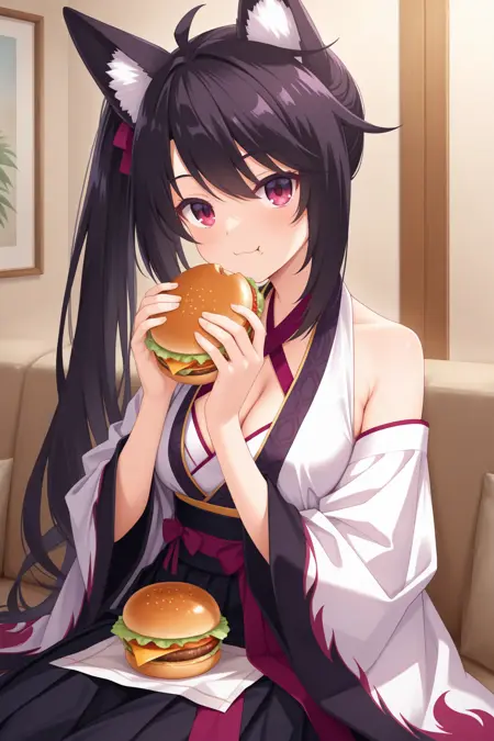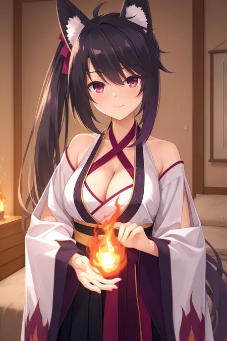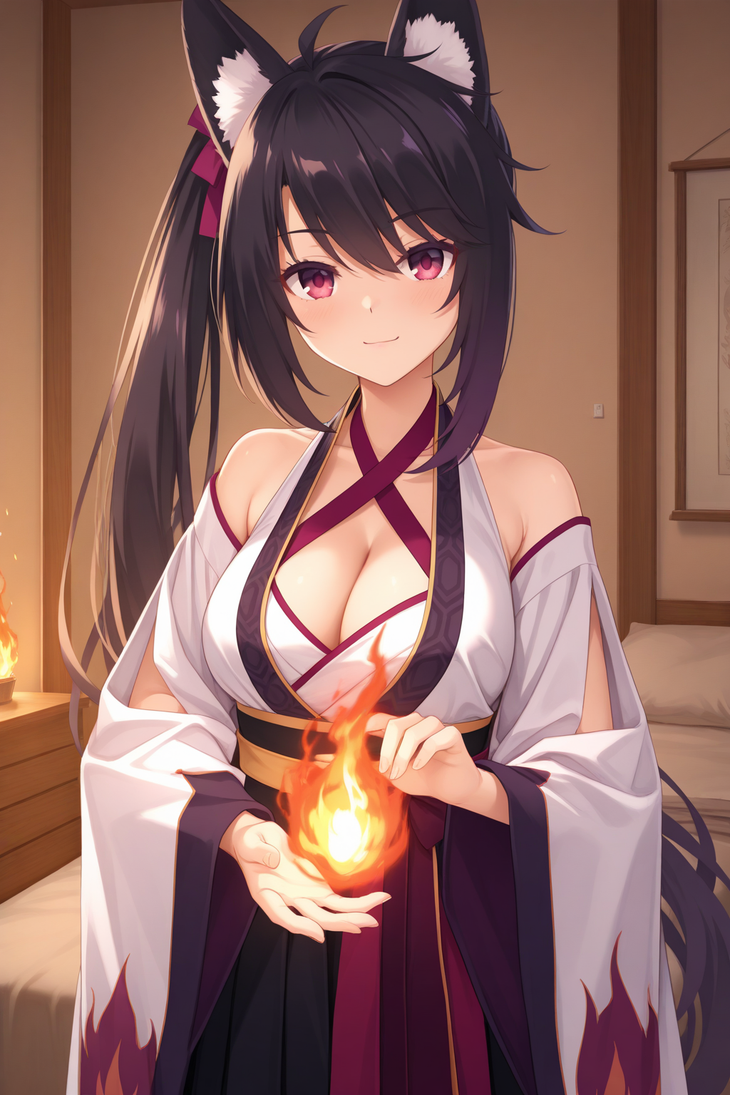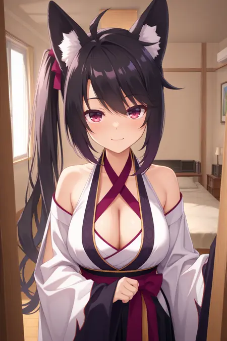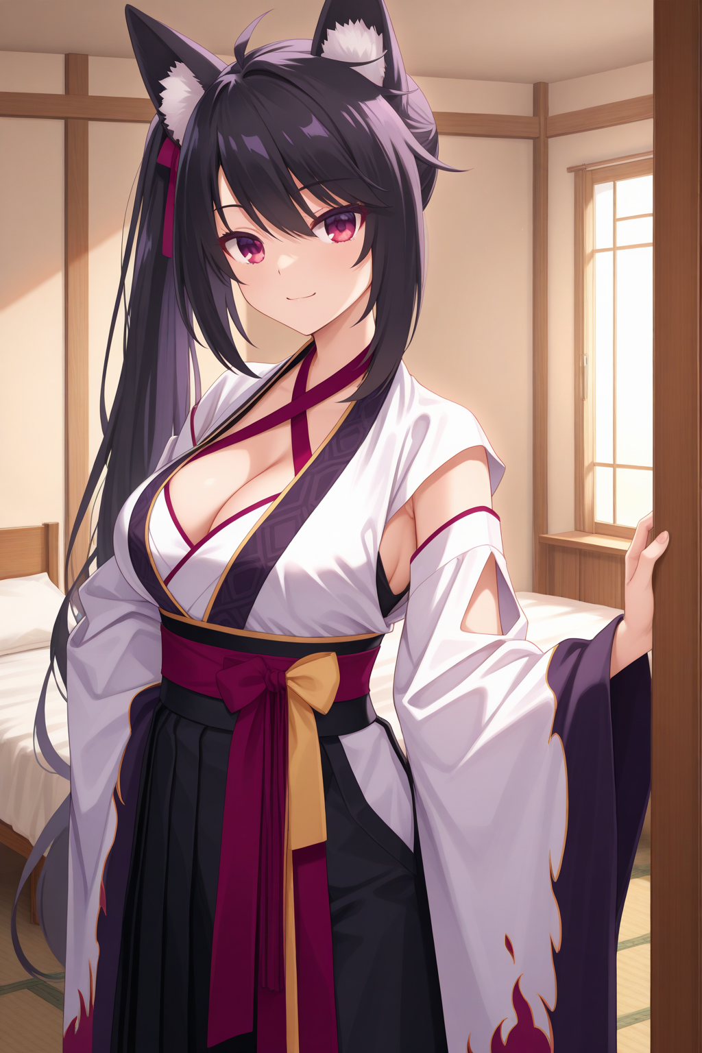 aakaguya, animal ears, animal ear fluff, red eyes, black hair, side ponytail, purple hair ribbon, japanese clothes, white kimono, criss-cross halter, cleavage, sleeveless kimono, wide sleeves, detached sleeves, sash, black hakama,
