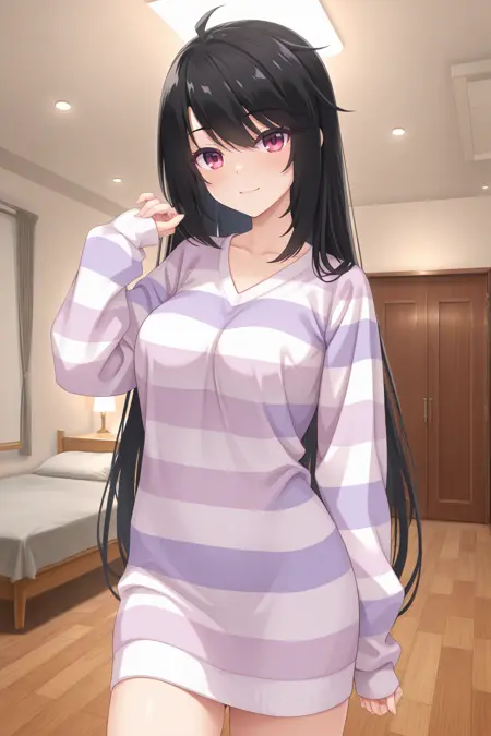 ddkaguya, red eyes, black hair, straight hair, sweater dress, striped sweater, long sleeves, sleeves past wrists,