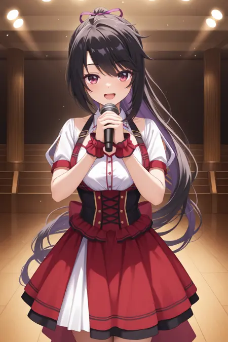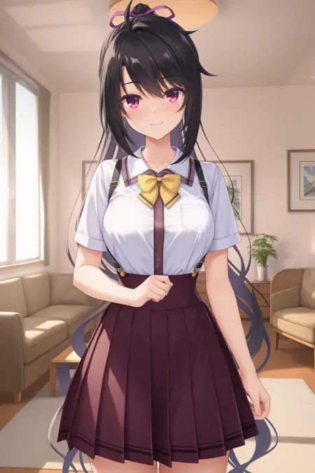 cckaguya, red eyes, black hair, ponytail, purple hair ribbon, school uniform, white shirt, short sleeves, yellow bowtie, brown skirt, suspender skirt, pleated skirt, high-waist skirt,