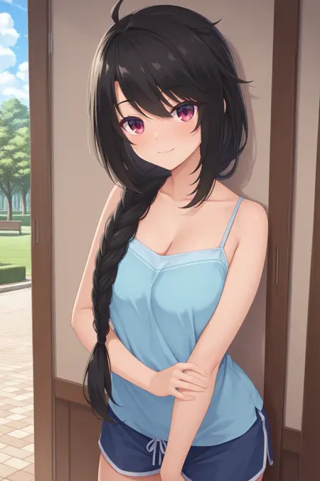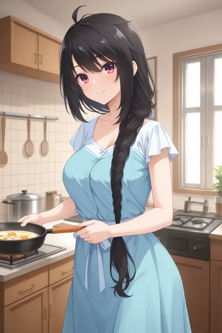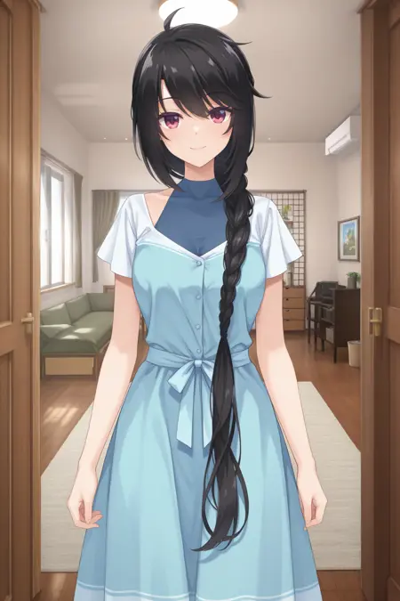 bbkaguya, red eyes, black hair, single braid, braided ponytail, hair over shoulder, blue dress, white sleeves, short sleeves,