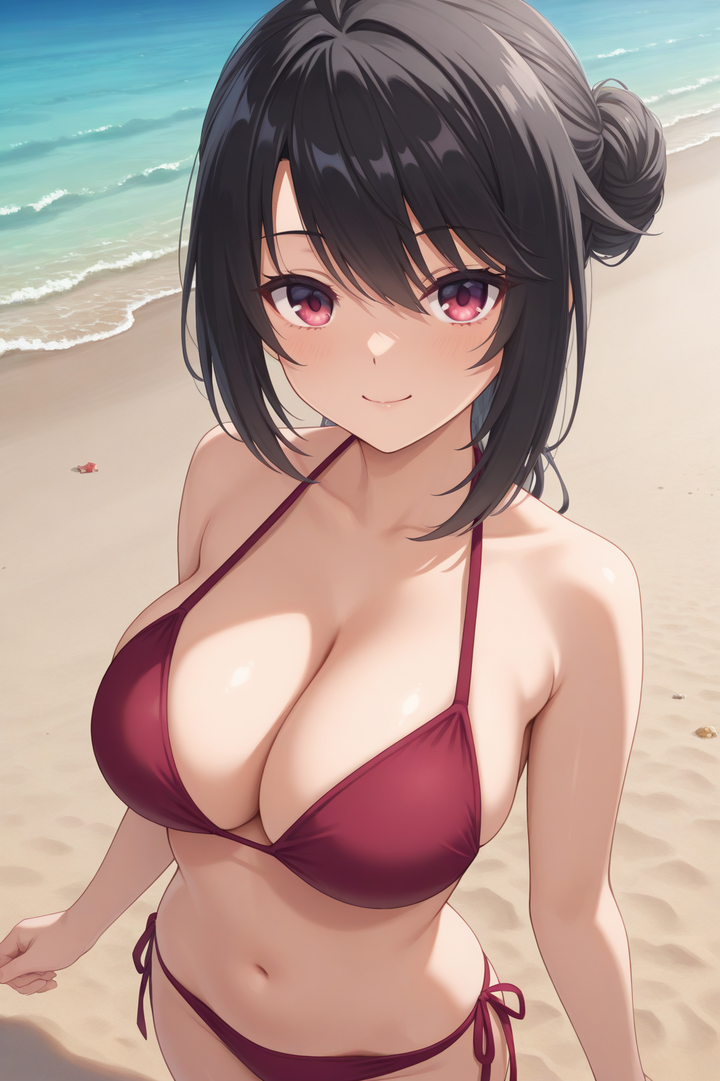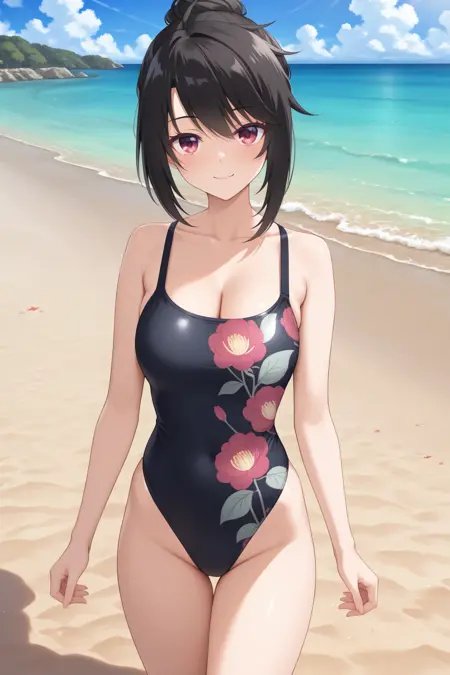 eekaguya, red eyes, black hair, single hair bun, black one-piece swimsuit, floral print, highleg swimsuit,