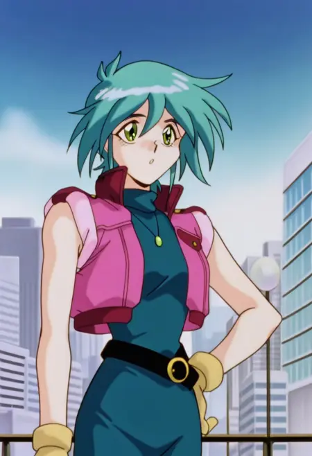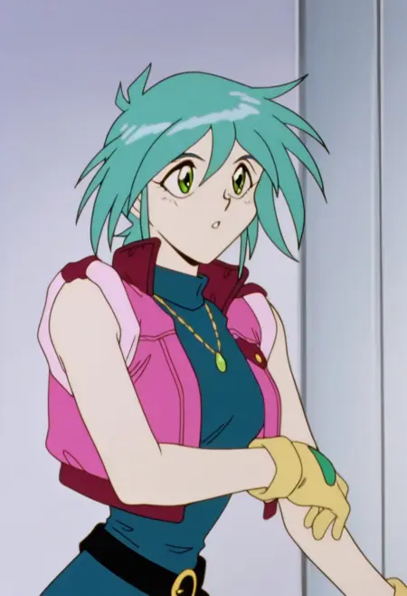 2gallenby, 초록색 눈, 소매 없는 재킷, 소매 없는 바디수트, 목걸이, 장갑, 벨트, 부츠, 애니메이션 스크린캡, 레트로 아트스타일,