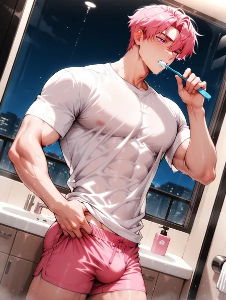 Prompts : 1boy, male, masculine, pink hair, short hair, pink eyes, colored skin, pink skin