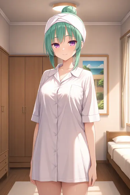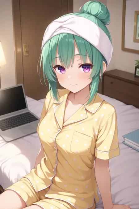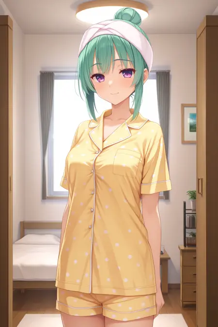 ddorie, 紫色眼睛,绿色头发,单发髻,头上搭着毛巾,黄色睡衣,波点衬衫,短袖,