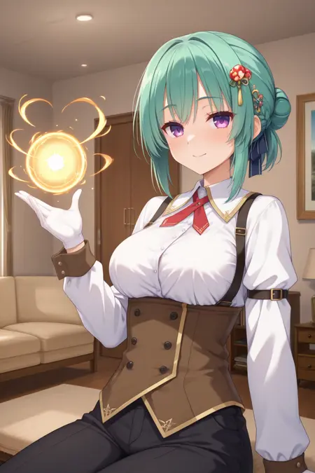 aaorie, 紫色眼睛,绿色头发,单发髻,发带,发饰,白衬衫,长袖,棕色马甲,黑色长裤,胸下,背带,臂带,白色手套,