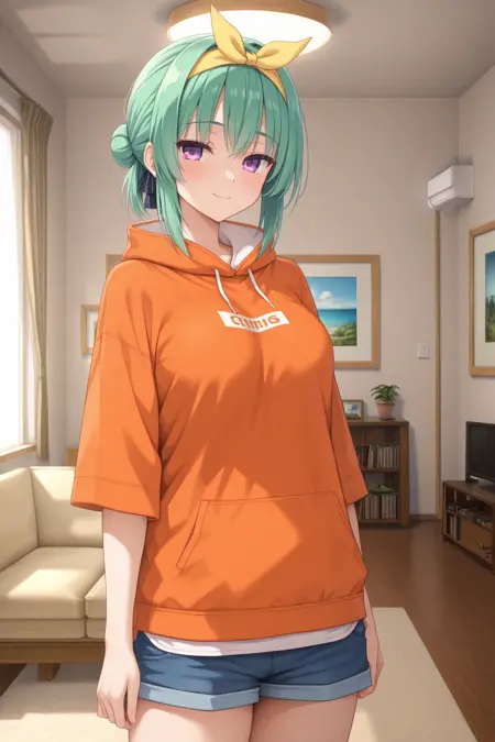 ccorie, purple eyes, green hair, single hair bun, yellow hairband, yellow bow, orange hoodie, sleeves rolled up, blue shorts, short shorts, denim shorts,