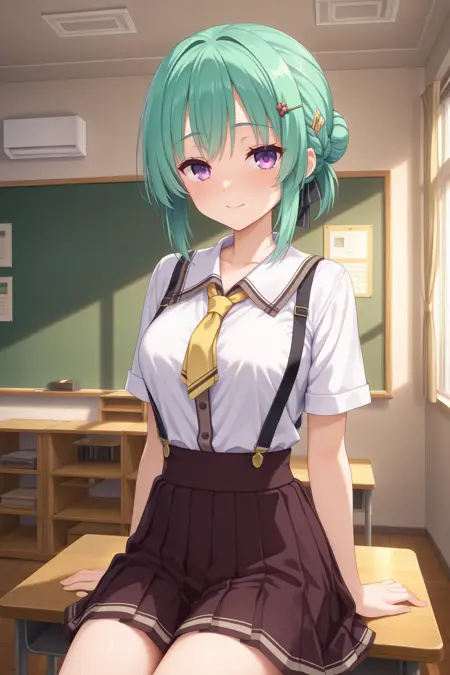 bborie, 紫色眼睛,绿色头发,辫子,单发髻,发夹,发饰,黑色丝带,发带,校服,白色衬衫,短袖,黄色领带,棕色裙子,背带裙,高腰裙,百褶裙,