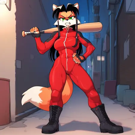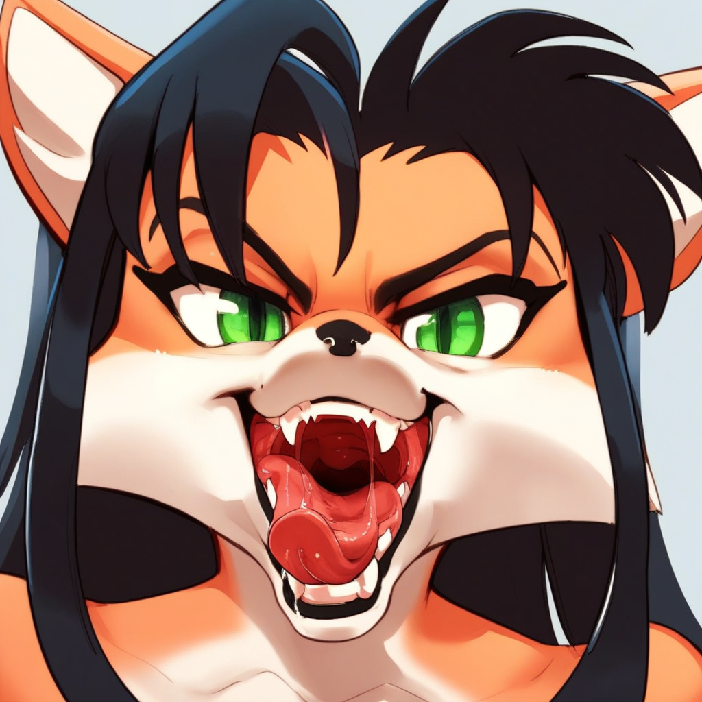 foxgirl, orange and white fur, green eyes, black hair, long hair, sidelocks, black nose, fox tail, large breasts,