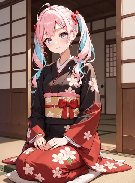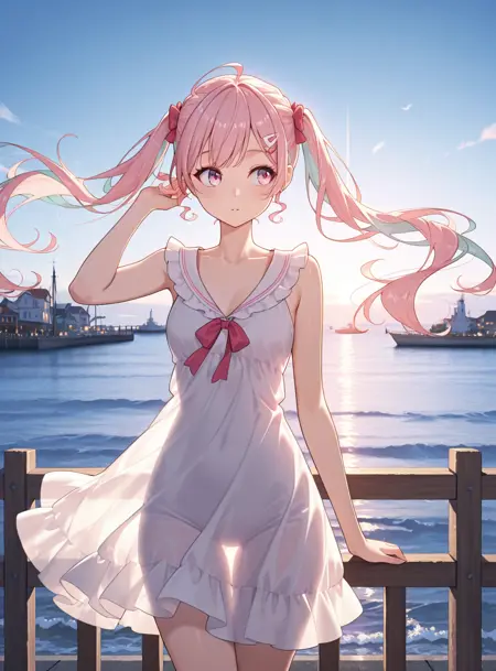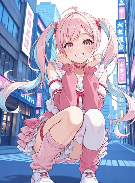 헤어스타일: "Nonchii, 트윈테일," 또는 "Nonchii, 긴 머리, " 옷: "체이커, 흰색 상의, 분리된 소매, 층층이 레이어드된 스커트," 허벅지 양말: "단일 허벅지 스트랩, 단일 허벅지 양말, 비대칭 풀어진 양말," 신발: "흰색 신발,"