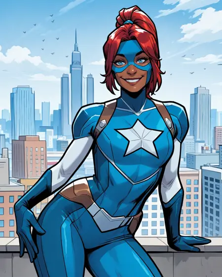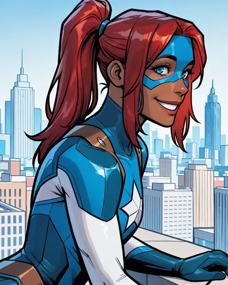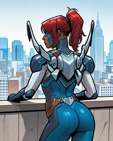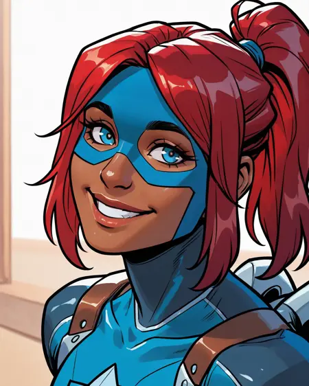 トリガー: libertymarvel, 暗色肌の女性、赤髪、青い目、ポニーテール、マスク、ボディスーツ、アーマー