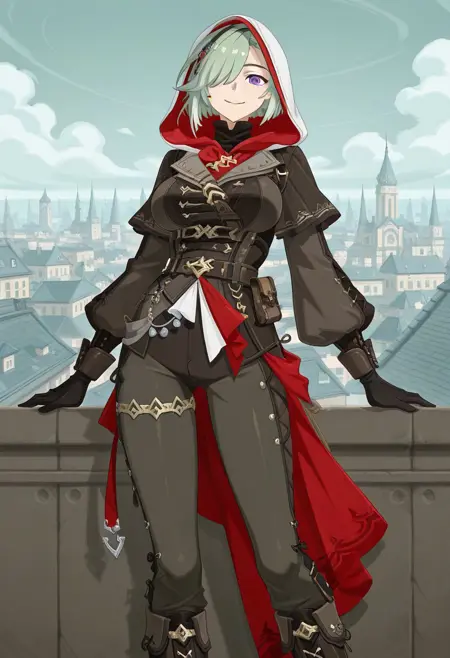 mara, 1girl, soul_seeker, official alternate costume, hair over one eye, purple eyes, green hair, gloves, hood, solo, black gloves, hood up,  large breasts, pants, long sleeves, belt, boots,