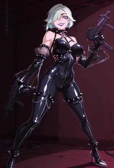 1girl, margth, hair over one eye, purple eyes, short hair, white hair, multicolored hair, spikes, purple lips, collar, large breasts, gloves, elbow gloves, bodysuit, jewelry, zipper, earrings, bare shoulders, latex, skin tight, black gloves, makeup, shiny clothes, chain, bondage outfit, high heels, detached sleeves, boots,
