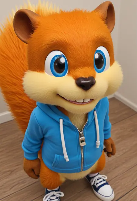 一般的な説明: 1人の男性、男性中心、リス、マスキュリン、かわいい、アンソロ、フューリー男性、出っ歯、オレンジ色の毛皮、青い目、リスの尾、ふさふさした尾、黒い動物の鼻、