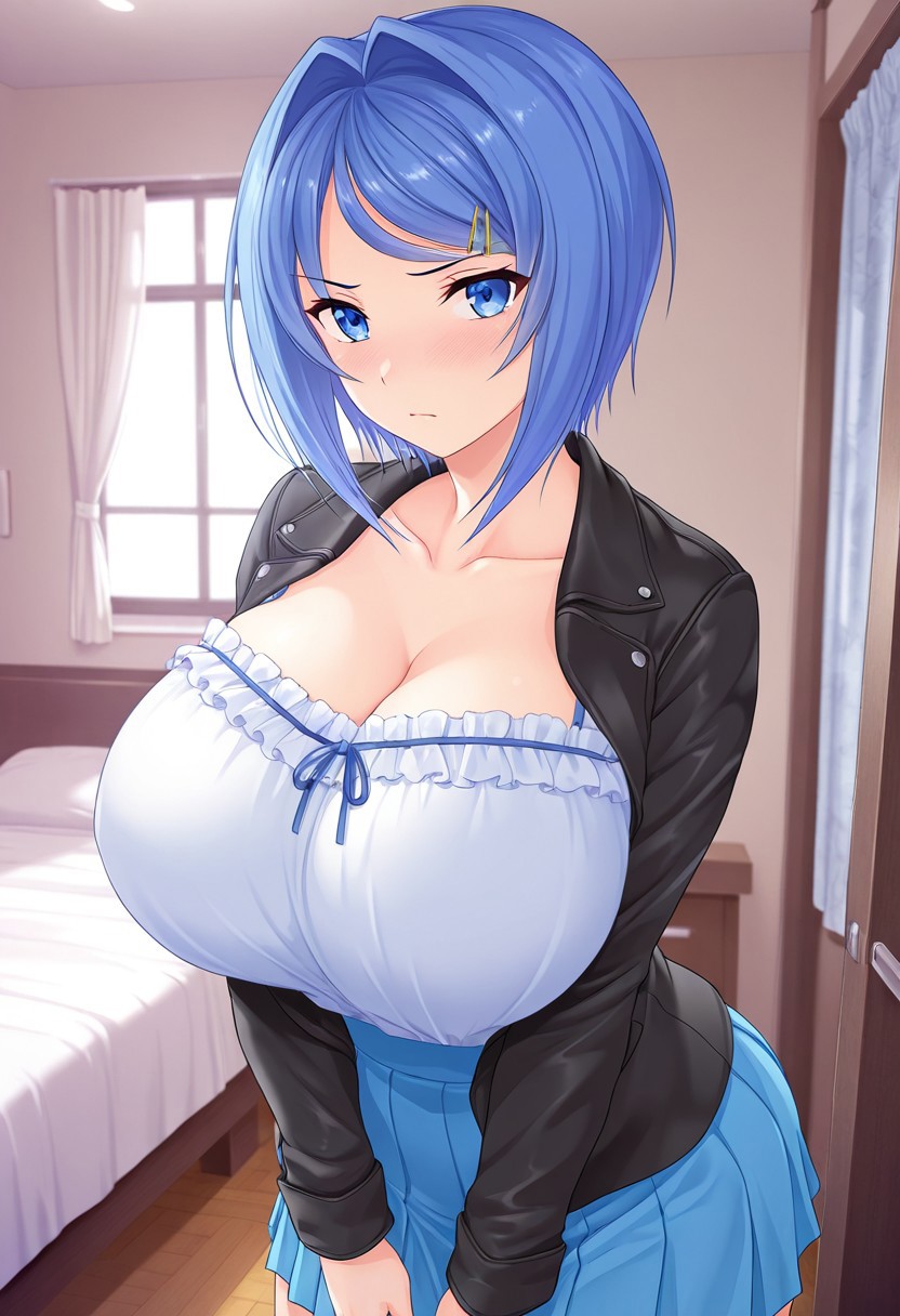 단발, 파란 눈, 파란 머리, 헤어클립, 거대한 가슴,