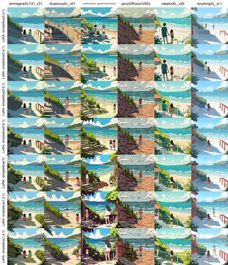 Midjourney에서 생성된 이미지 데이터셋으로 학습되었으며, 복고적이고 간소한 화풍이 특징입니다. 생성된 이미지는 대개 근경 구성이 많으며, 인물들은 둥글고 만두 같은 얼굴 특징을 띱니다. 여러 모델을 시험해 본 결과, 모두不同程度의 효과를 보였지만, 전반적으로 Noobai가 생성한 이미지를 사용한 체크포인트가 더 우수한 화면 품질을 제공합니다. 이 LoRA는 책 삽화에 적합할 수 있습니다. 여러 인물을 포함한 이미지는 왜곡되기 쉬우므로 Adetailer를 사용해 수정해야 할 수 있습니다.