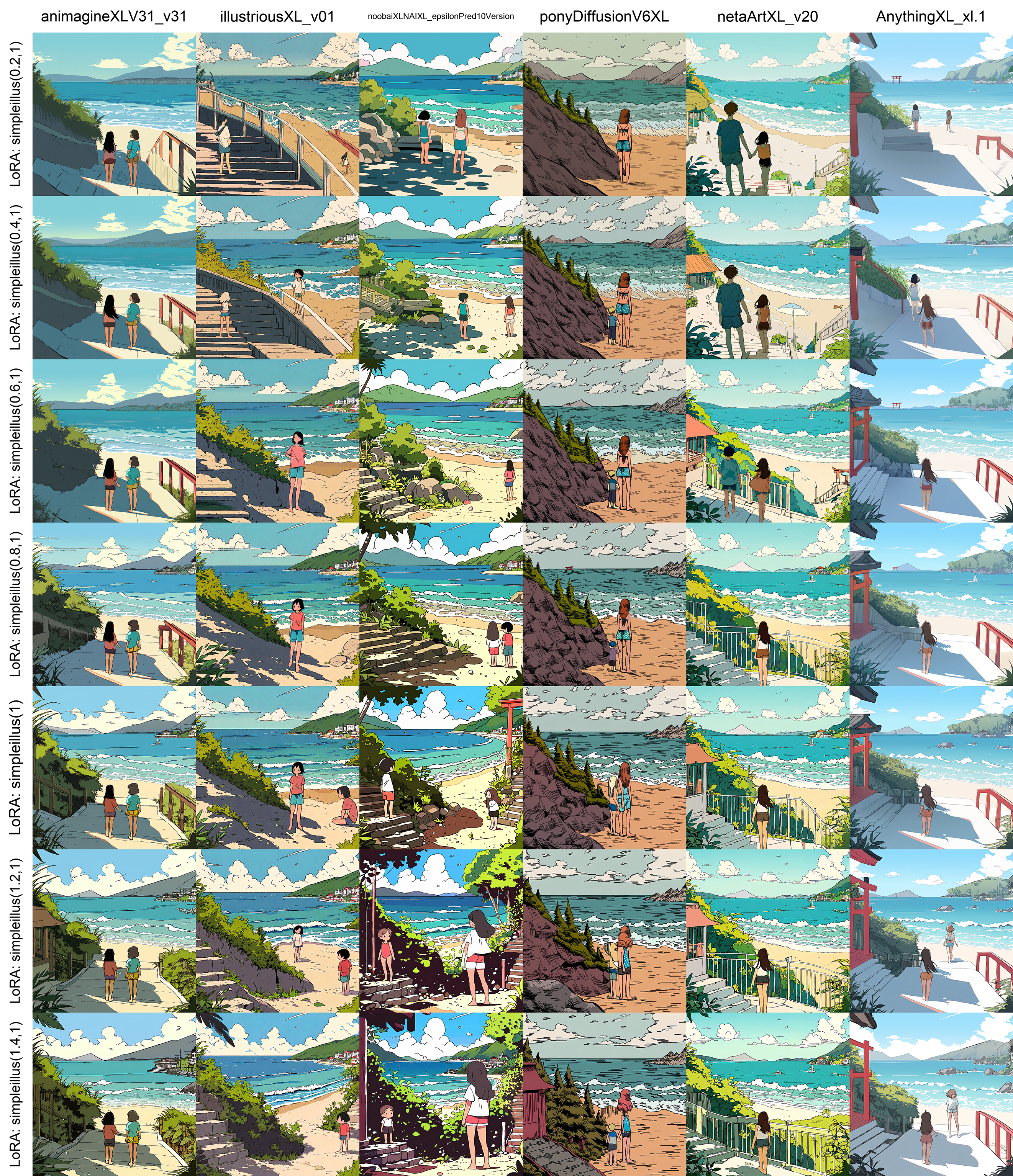 Midjourneyで生成された画像データセットに基づいてトレーニングされたモデルで、レトロでシンプルな画風が特徴です。生成される画像は近景寄りになりやすく、人物の顔は丸くて包子(バオズ)のような顔立ちになります。複数のモデルを試しましたが、いずれも不同程度で効果を発揮しましたが、全体的にNoobaiが生成した画像を使用したチェックポイントの方が画質が優れており、書籍の挿絵に適していると感じます。複数の人物を含む画像は崩れやすいので、リペア用にAdetailerの使用を推奨します。