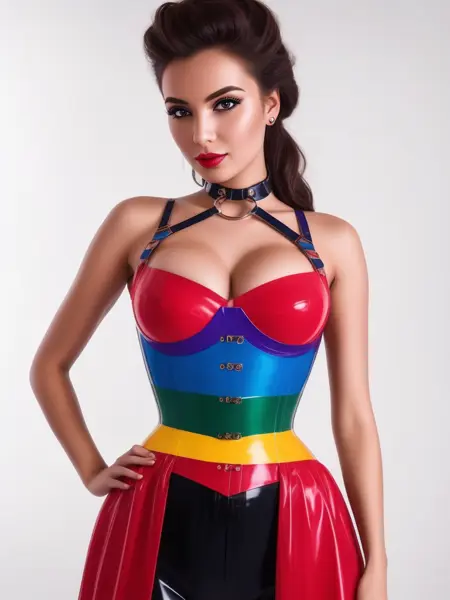一位美丽迷人的女性身穿乳胶服饰,配有束身带与金属颈圈的肖像