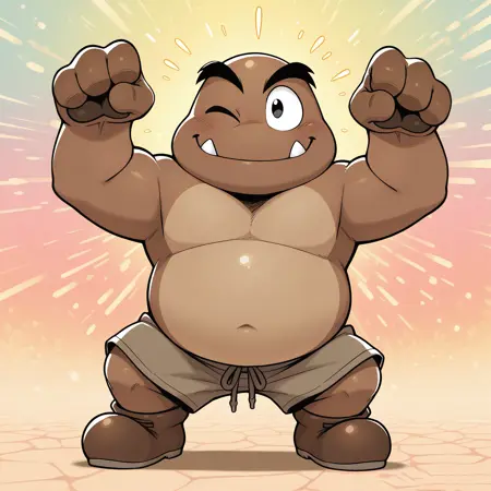 アンスロには以下のプロンプトを使用してください:goomba, dark skin, brown body, brown skin, anthro, big eyebrows, black eyes, tusks, fangs, noseless, no nose, fat, plump