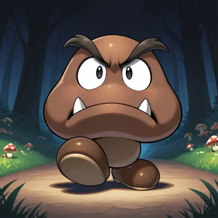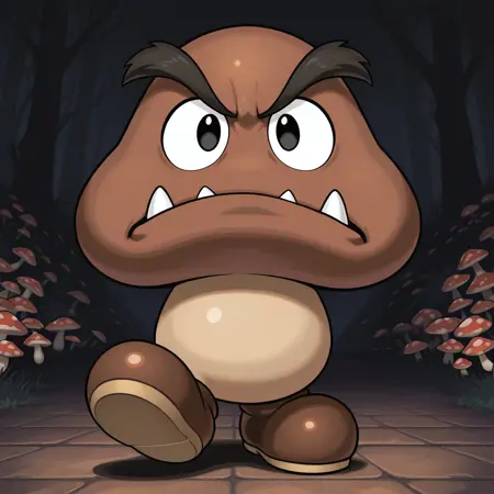 オリジナルのグームバには以下のプロンプトを使用してください:goomba, dark skin, brown body, big eyebrows, black eyes, tusks, fangs, noseless, no nose, feral, no arms, armless, brown boots, legless, no legs, nintendo, super Mario bros