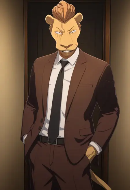 FreeBeastars, 1boy, mature male, male, athletic build, anthro, lion, light golden-yellow fur, strawberry-blond hair, pompadour, animal ears, white eyes, scar over right eye
