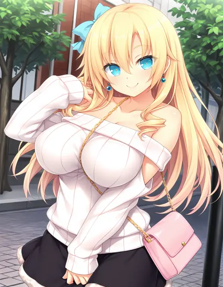 衣装02、ヘアリボン、アクア色ヘアリボン、イヤリング、ジュエリーイヤリング、アクア色イヤリング、セーター、白セーター、オフショルダーセーター、肩出し、ロングスリーブ、スリーブカットアウト、手首より長めのスリーブ、スカート、黒スカート、ファー縁取りスカート、ミニスカート、バッグ、ピンクバッグ、ゴールドチェーンストラップバッグ、斜めバッグ、