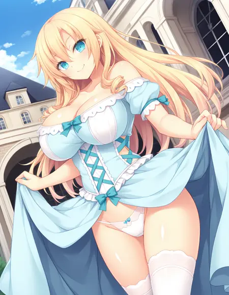 衣装07、ドレス、薄い青ドレス、プリンセスドレス、ストラップレスドレス、ロングドレス、フリルドレス、リボンドレス、アクアリボン、オフショルダードレス、ショートスリーブ、パフスリーブ、ラックアップウエスト、スリットスカート、センター スリット、パンティ、白パンティ、ハイレグパンティ、ストリングパンティ、タイツ、白タイツ、バストライン、肩出し、ミッドリフ、鼠蹊部、