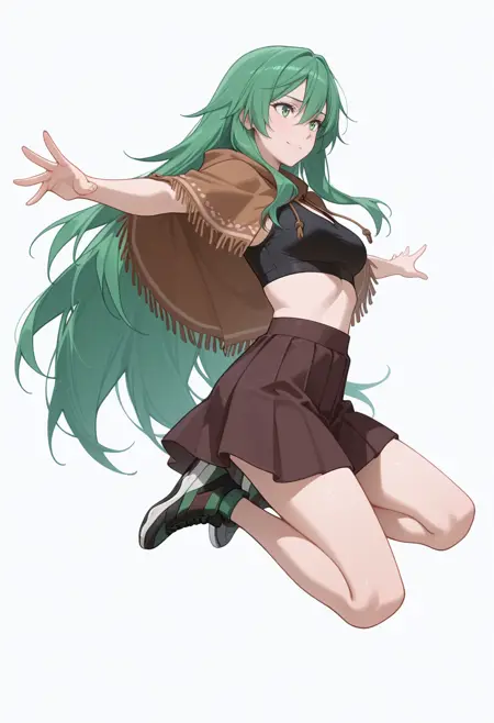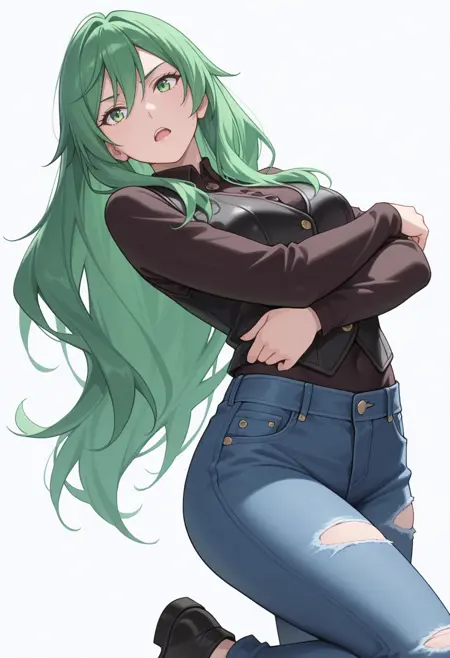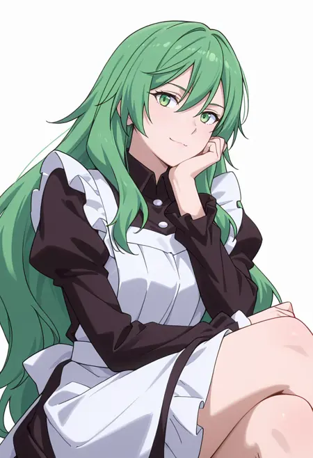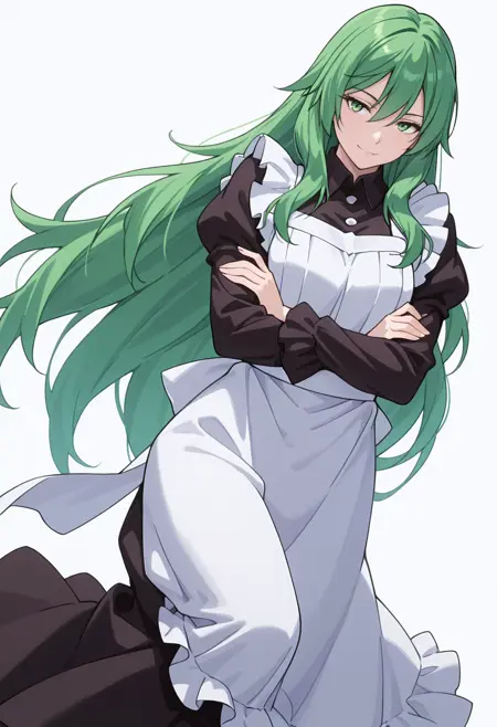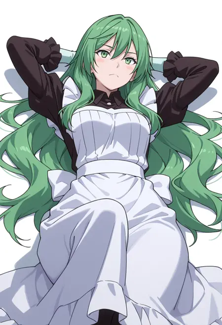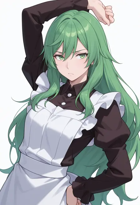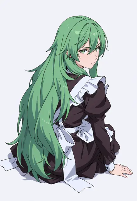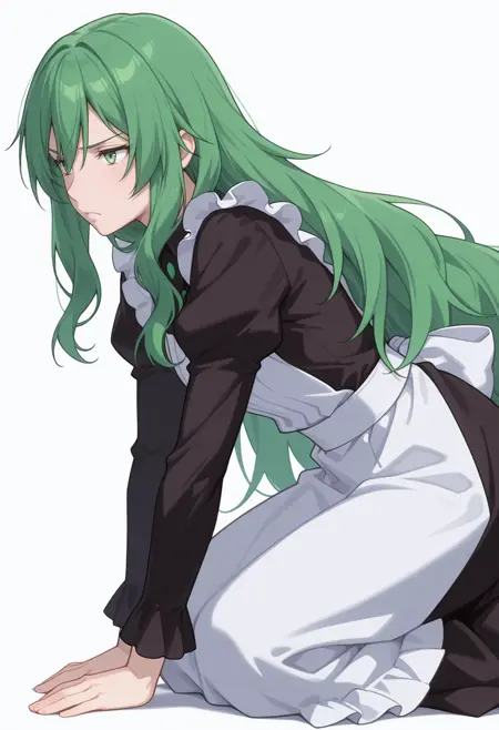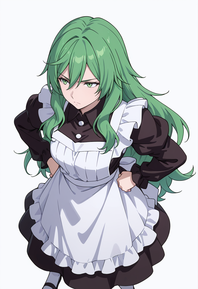 1girl, green hair, green eyes, hair between eyes, frown, very long hair, sidelocks,