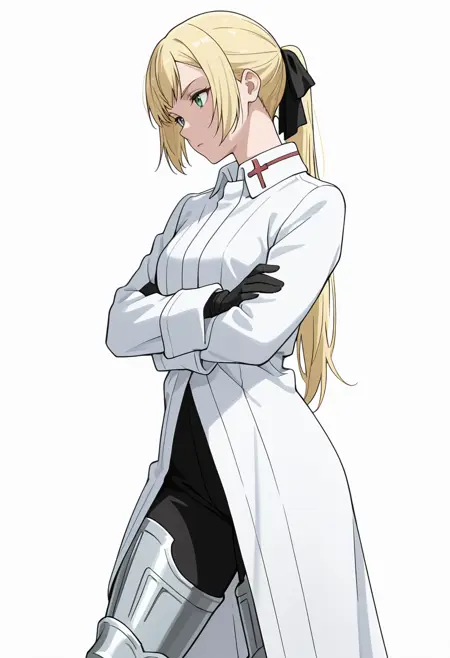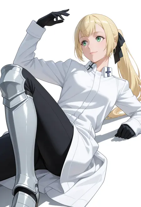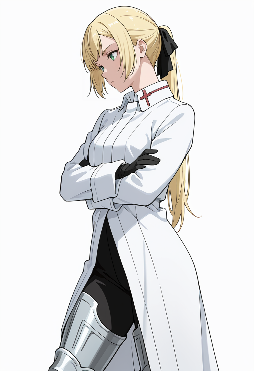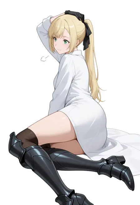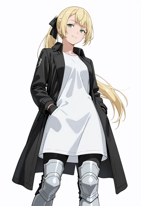 shirt, white shirt, coat, black gloves, hair ribbon, armored boots,