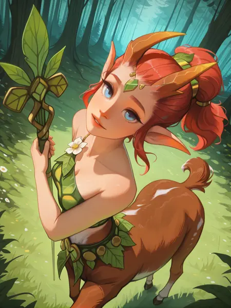 주요 키워드: "뾰족한 귀, 빨간 머리, 꼬리머리, 머리 장식, 이마 보석, 몬스터 소녀, 토르, 센타우루스, 파란 눈, 뿔"