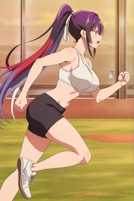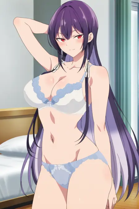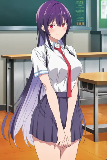 <lora:Takamine-IL-v1-08:0.9>, ChopioT4kamine, 非常长的头发,紫色头发,双色头发,侧发,白色丝带,发带,白色丝带,红色眼睛,注视观众,
