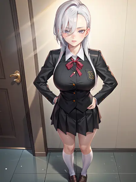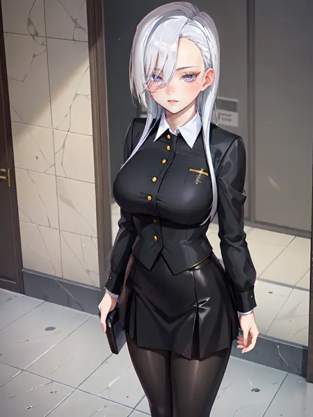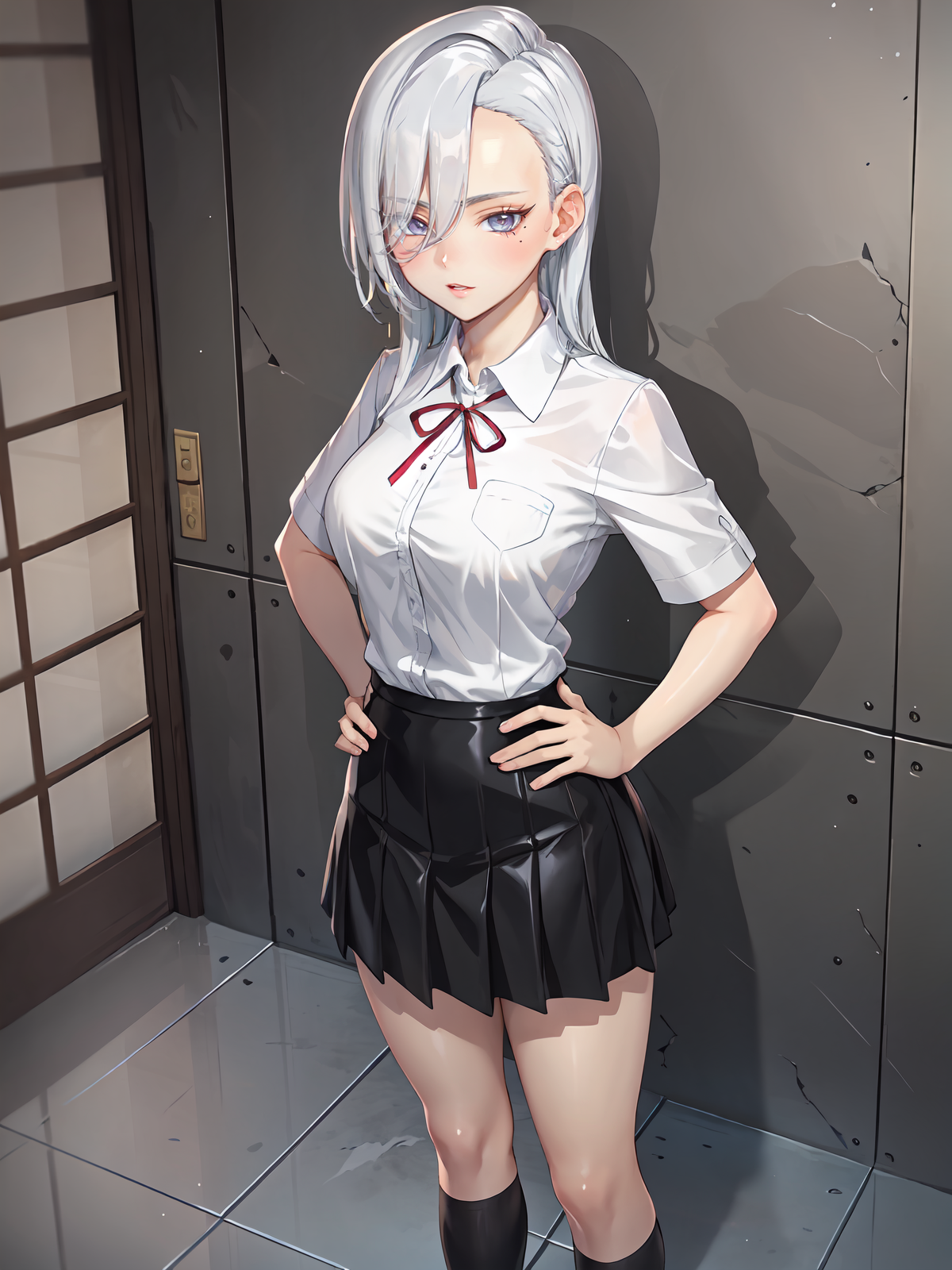 提示词: 眼下有痣、头发位于两眼之间、灰色眼睛、头发下可见的眼睛、白发