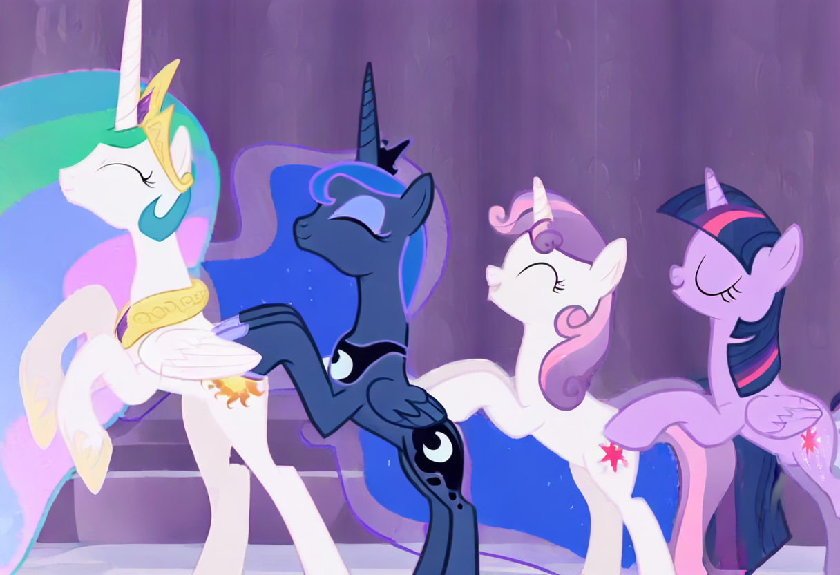 描画スタイルが出力され、それを避けたい場合(そのスタイルの画像は1枚だけですが、さまざまな切り抜きがあります)、強度を下げてみるか、否定プロンプトに「painting」を追加し、肯定プロンプトに「my little pony, friendship is magic」を追加してみてください。