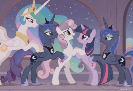 Intended syntax (order does not really work): conga line, pony, character1 hooves on character2, character2 hooves on character3, character3 hooves on character4, my little pony, friendship is magic
