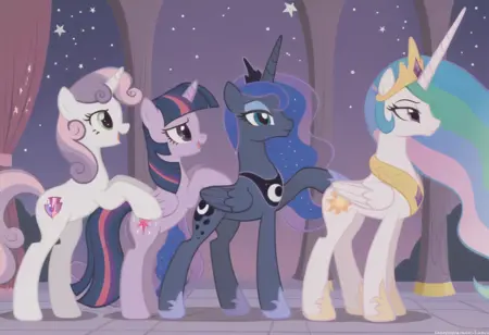 An example of a caption it was trained on: "applejack hooves on fluttershy, rarity hooves on twilight sparkle, twilight sparkle hooves on pinkie pie, fluttershy hooves on rarity, side view, open smile, facing right, blue background, conga line, twilight sparkle with eyes closed, pinkie pie with eyes closed, rarity with eyes closed, applejack with eyes closed, fluttershy with eyes closed, twilight sparkle wearing party hat, applejack wearing party hat, rarity wearing party hat, my little pony: friendship is magic, unicorn twilight"