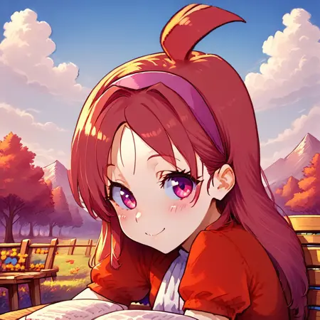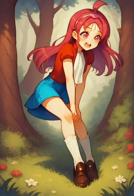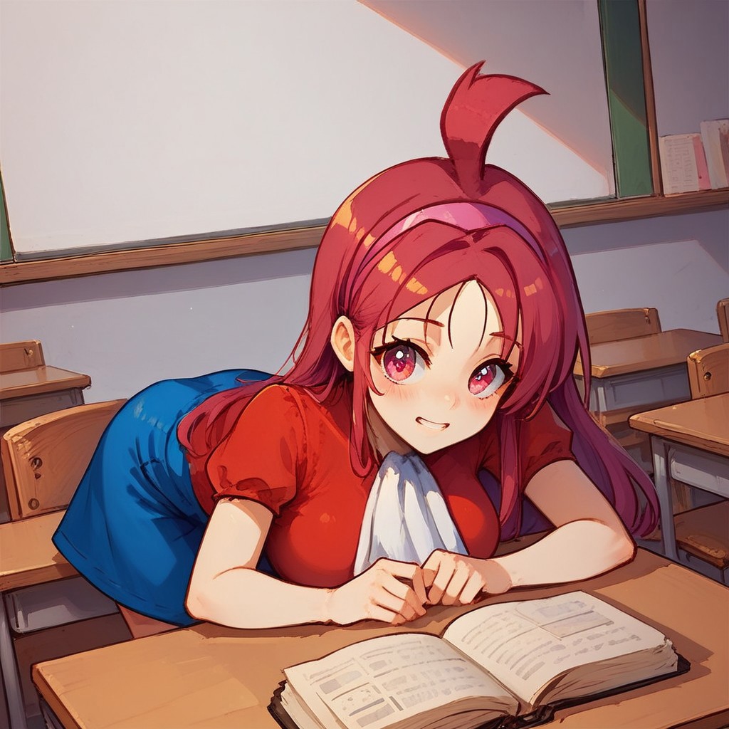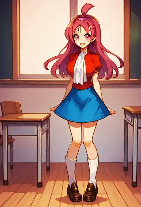 aki-smttcg ,ahoge ,waist-length hair, long hair ,straight hair ,magenta hair ,parted bangs ,pink eyes,pink hairband ,{{{solid shirt}}} ,red shirt, puff sleeve,short sleeves, white ascot,long ascot, blue skirt,mini skirt, prairie skirt, white loose socks ,loafer