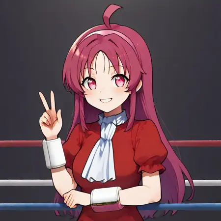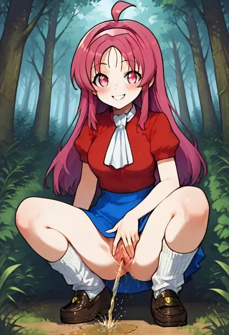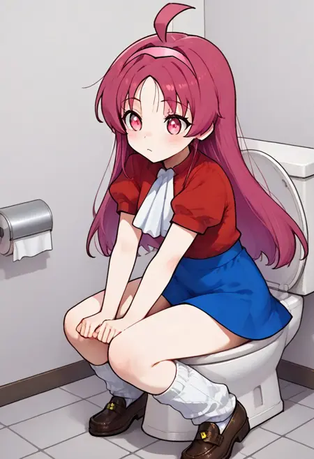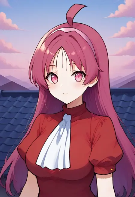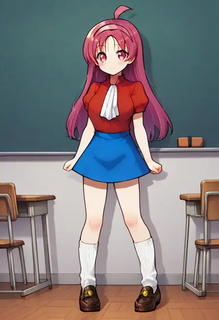 aki-smttcg ,ahoge ,waist-length hair, long hair ,straight hair ,magenta hair ,parted bangs ,pink eyes,pink hairband ,{{{solid shirt}}} ,red shirt, puff sleeve,short sleeves, white ascot,long ascot, blue skirt,mini skirt, prairie skirt, white loose socks ,loafer