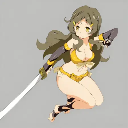 긴 머리, 갈색 머리, 노란 비키니, 수영복, 가슴, 머리핀, 배꼽, 스티럽, 검은 팔꿈치 장갑, 손가락 없는 장갑, 곡선형, 젊음, 흰색 리본,