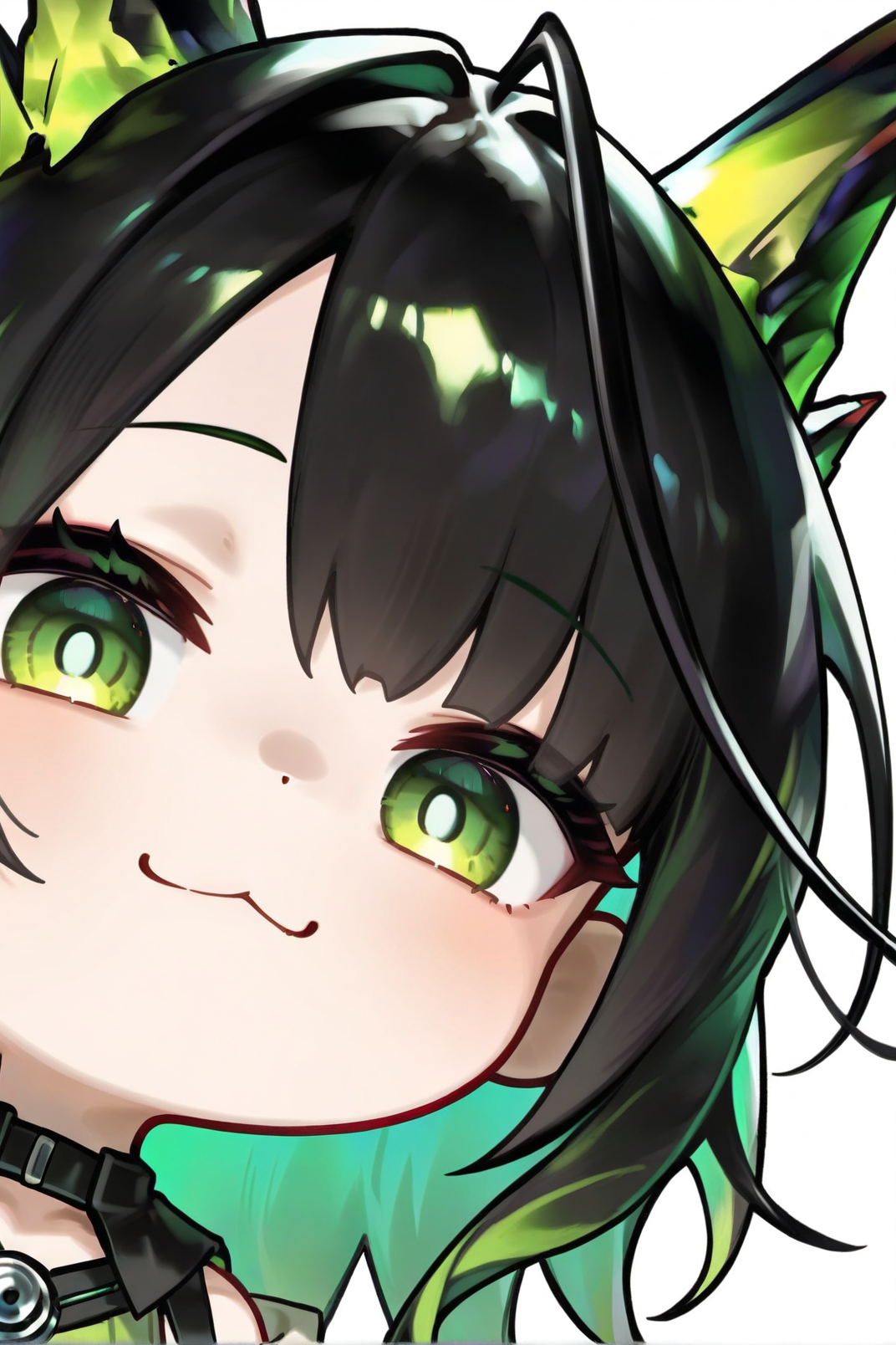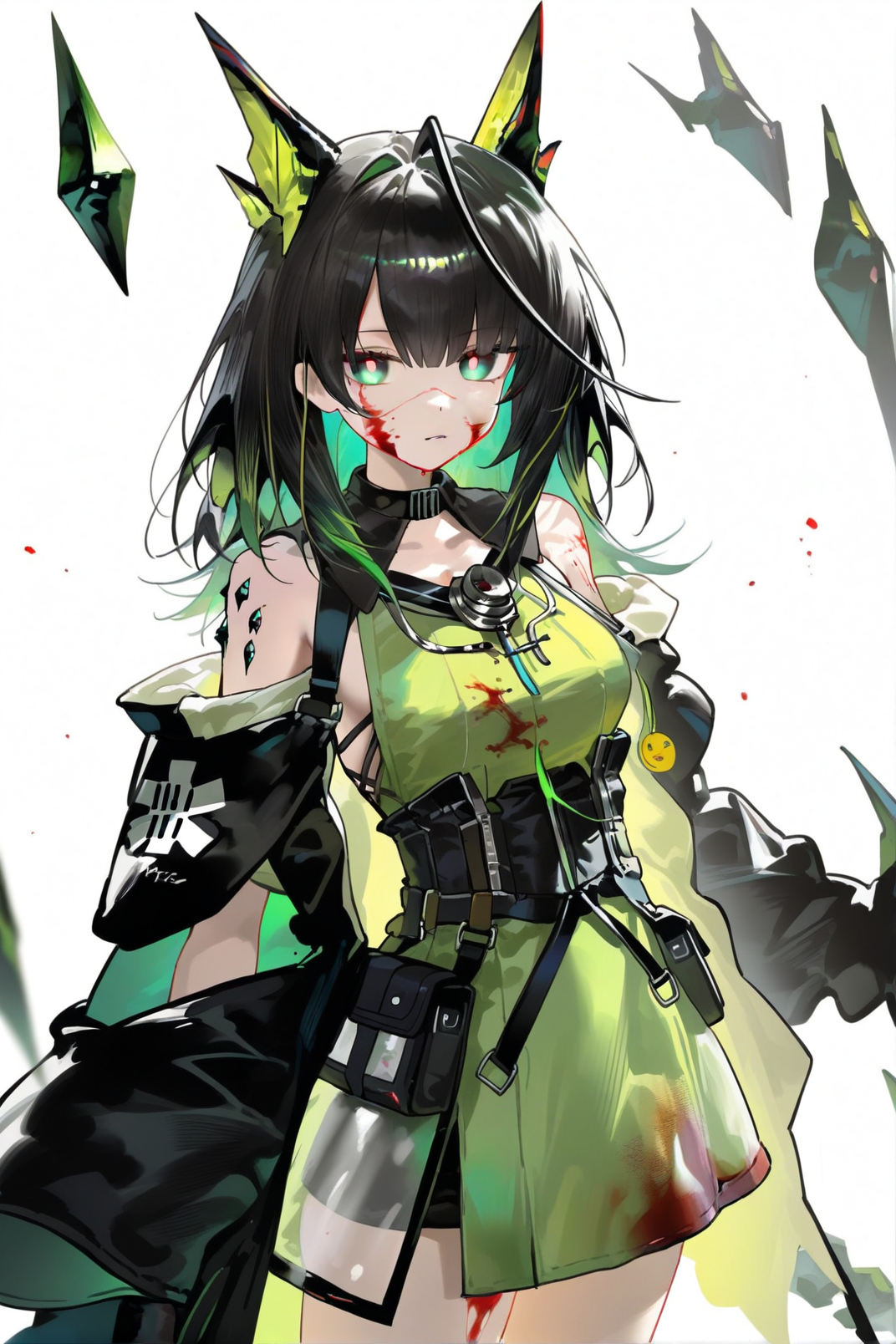 mon3tr \(明日方舟\), 1girl, 单人, 黑发, 连衣裙, 绿色连衣裙, 动物耳朵, 长发, 夹克, 黑色夹克, 露肩, 大腿绑带, 袖子长过手指, 衣物敞开, 袖子长过手腕, 长袖, 开襟夹克, 猫耳,