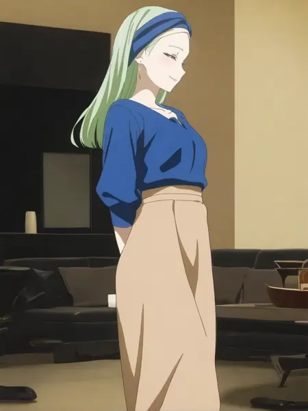 additional supports:蓝色衬衫,无领,高腰连衣裙,棕色连衣裙,长裙,黑色鞋履