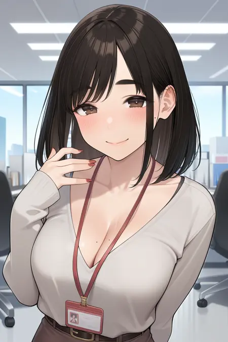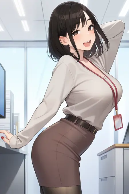 kouhaichan, medium hair, black hair, parted bangs, sidelocks, brown eyes, mole on cheek, red nails, long sleeves, grey shirt, lanyard, mole on breast, brown skirt, pencil skirt, belt, brown pantyhose, grey footwear, strappy heels