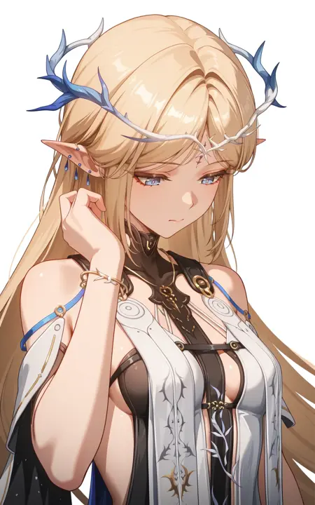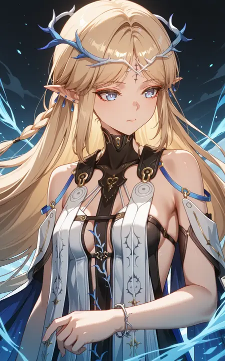 上半身: cartethyia\(wuthering waves\),1girl,solo,long hair,jewelry,breasts,pointy ears,dress,blonde hair,braid,earrings,blue eyes,very long hair,bracelet,bare shoulders,small breasts,white dress,medium breasts,cowboy shot,